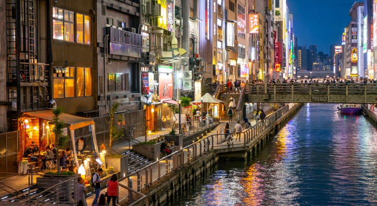 도톤보리는 오사카를 대표하는 유흥 거리로, 불을 비추는 광고물과 함께 유명한 맛집, 상점 등이 모여 있는 곳입니다. 오사카의 대표적인 건축물인 그리고 타케시시 부동산 사옥을 비롯해 각종 쇼핑센터, 유흥시설, 음식점 등이 위치해 있습니다. 저녁이 되면 도톤보리 강가에서는 이국적인 야경을 볼 수 있으며, 여러 가지 식료품과 음식을 즐길 수 있는 난바 그랜드 칸, 난바 워크스, 오사카 도민성공원, 일본 전통 목욕탕인 슈퍼 스파 와오 등이 있어 즐길 거리가 많습니다.