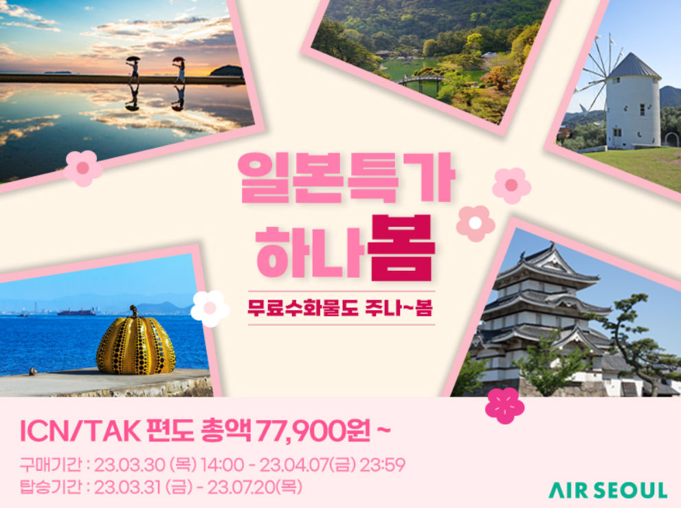 에어서울은 3월 30일부터 4월 7일까지 일본 노선 특가 및 무료 위탈수하물 이벤트를 실시하는데요. 공항시설 사용료, 유류할증료가 모두 포함된 일본 항공권 특가 편도액은 6만7900원에서부터 시작이랍니다. 왕복으로 치면 14만원도 안되는 금액인 것이죠.