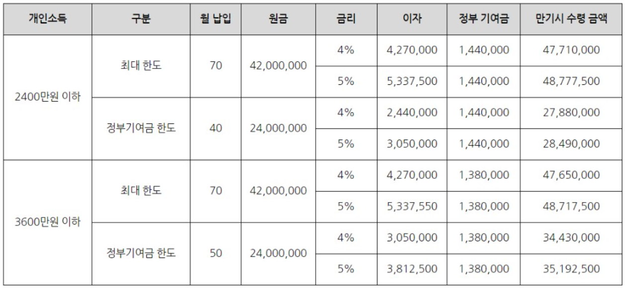| 납입 금액 | 최소 40 ~ 최대70만원 | 최대 50만원 |